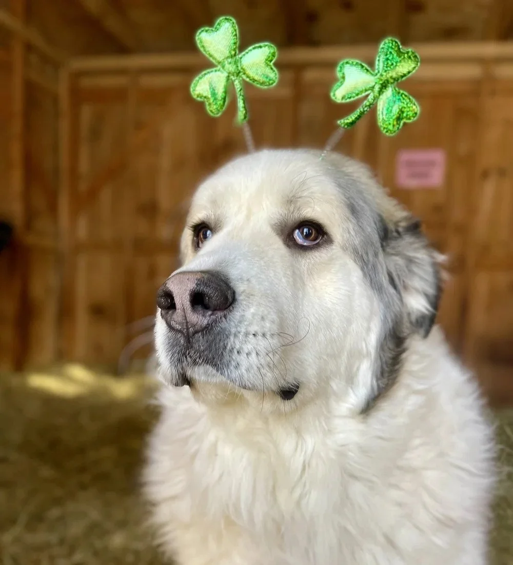 Kane is the youngest of our Guardian dogs! He lives with his best pal, Adira and their flock of sheep! He is the sweetest boy who unfortunately had to have surgery. Any donations made towards Kane will be for his continued care. Please send this boy some love this St. Paddy’s Day!